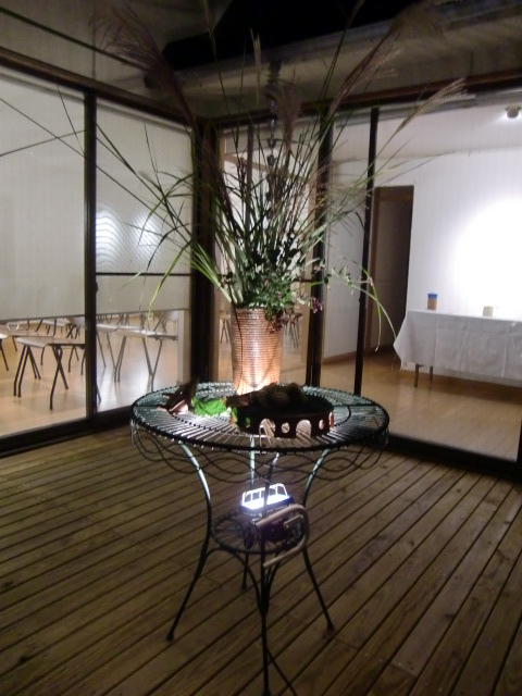 (改装された音楽ホール「緑風舎」の中庭には陶芸家沖康史さんの作品が展示され、お彼岸、中秋の名月にふさわしいススキの穂が活けられていました)