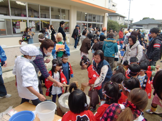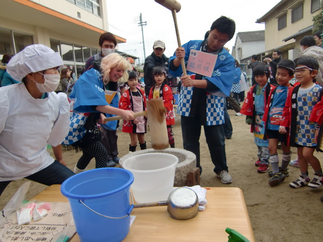 この日の持ちつき大会には、保育園児約60人とその父母、さらには「こうした機会に国際交流も」と和歌山大学で学ぶ留学生11人も招待されていました。