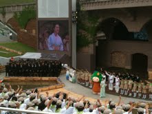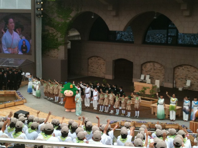 エピローグでは、坂本冬美さんの紹介で、式典で大役を果たしたボーイスカウト、ガールスカウト、和歌山児童合唱団など各団体、子どもたちのグループが紹介され、キノピーを含む出演者全員で「樹の国・声の森」の大団円。感動的なフィナーレとなりました。