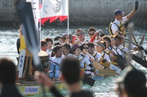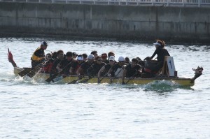 ドラゴンボートは20人の漕ぎ手が太鼓の音に合わせてその速さを競うもので、マリーナシティの防波堤内に設けられたコースで争われました。